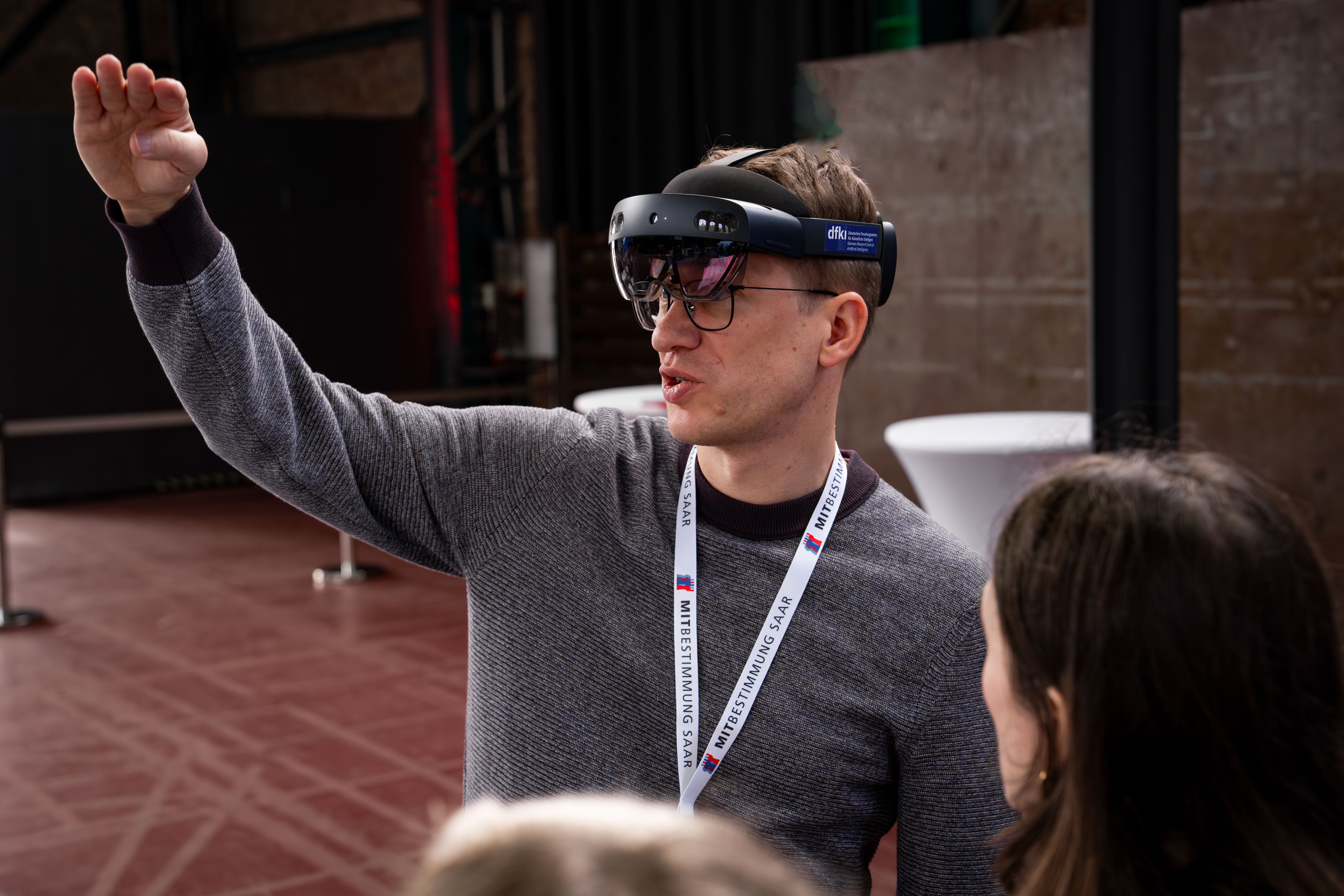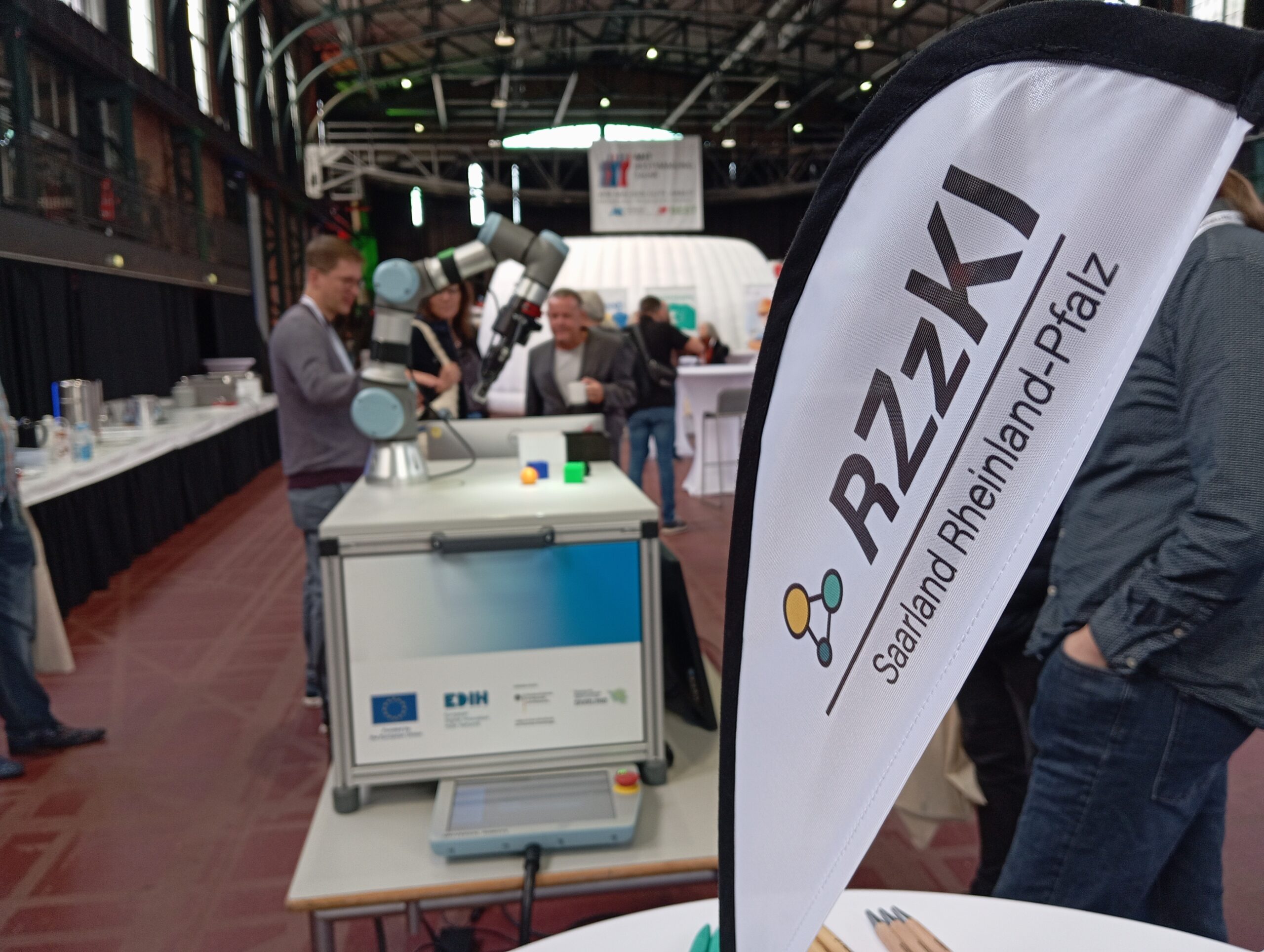 Auch das Regionale Zukunftszentrum für Künstliche Intelligenz (RZzKI) war mit einem eigenen Stand vertreten und präsentierte dabei zwei Demonstratoren, die Chancen von KI und XR (Extended Reality) für den betrieblichen Alltag erlebbar machte. Die Besucher konnten u.a. einen Roboterarm über ein Mikrofon steuern, indem sie die z.B. die Anweisung „Lege den grünen Würfel in die weiße Box“ zum System sagten. Besonders im Fokus stand der XR-Demonstrator aus dem Green-AI Hub Projekt, der von Dr. Sönke Knoch, Projektleiter am RZzKI, vorgestellt wurde. Im Saarländischen Rundfunk (SR) war der Demonstrator in der Sendung Aktueller Bericht zu sehen – ab Minute 20 in der ARD Mediathek.